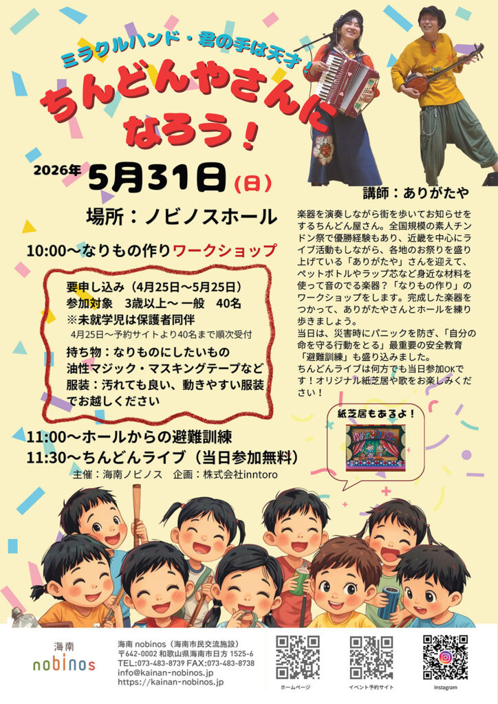 | 日時 | 2026年5月31日(日) ①なりもの作りワークショップ 10:00~ ②ちんどんライブ 11:30~ (申込不要) |